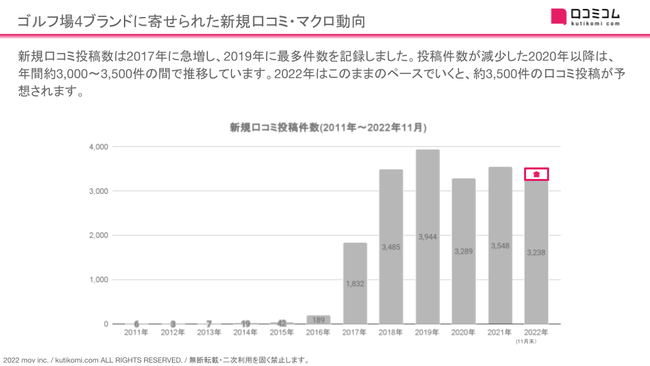 新規口コミ投稿数は2017年に急増し、2019年に最多件数を記録しました。投稿件数が減少した2020年以降は、年間約3,000~3,500件の間で推移しています。2022年はこのままのペースでいくと、約3,500件の口コミ投稿が予想されます。