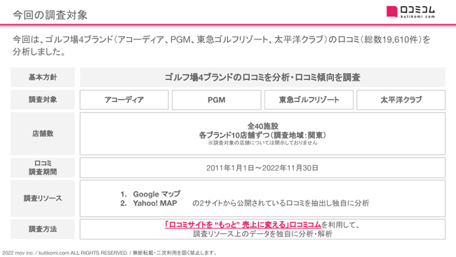 今回は、ゴルフ場4ブランド(アコーディア、PGM、東急ゴルフリゾート、太平洋クラブ)の口コミ(総数19,610件)を分析しました。