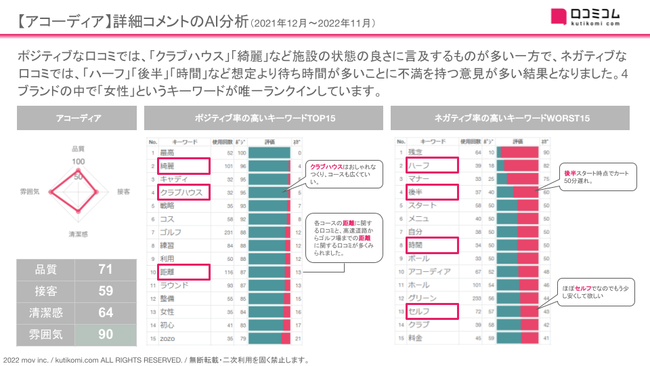 ポジティブな口コミでは、「クラブハウス」「綺麗」など施設の状態の良さに言及するものが多い一方で、ネガティブな口コミでは、「ハーフ」「後半」「時間」など想定より待ち時間が多いことに不満を持つ意見が多い結果となりました。4ブランドの中で「女性」というキーワードが唯一ランクインしています。