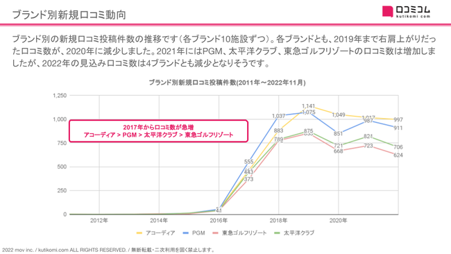 ブランド別の新規口コミ投稿件数の推移です(各ブランド10施設ずつ)。各ブランドとも、2019年まで右肩上がりだった口コミ数が、2020年に減少しました。2021年にはPGM、太平洋クラブ、東急ゴルフリゾートの口コミ数は増加しましたが、2022年の見込み口コミ数は4ブランドとも減少となりそうです。