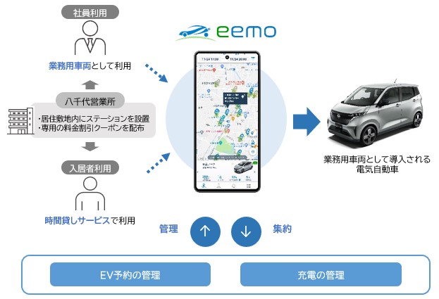 この取り組みは、大東建託パートナーズの八千代営業所(千葉県八千代市)によって新たに導入される、業務用EVの未利用時間を活かす新たな活用策として、同社が管理する賃貸住宅に住む入居者を対象に開始します。本サービスは、REXEVが提供するEV特化型のカーシェアサービス「eemo(イーモ)」アプリで予約することによって利用が可能です。また、入居者向けには、大東建託パートナーズの運営する、暮らしに役立つサービスプラットフォーム「ruum(ルーム)」から本サービスの利用促進に向けた案内を行い、入居者のさらなる暮らしの利便性向上をはかります。車両の予約情報はEV車載蓄電池の充電情報とともにクラウド上で集約・管理され、EVエネルギーの制御によって、利用者へ安定したEVカーシェアサービス提供につなげていきます。