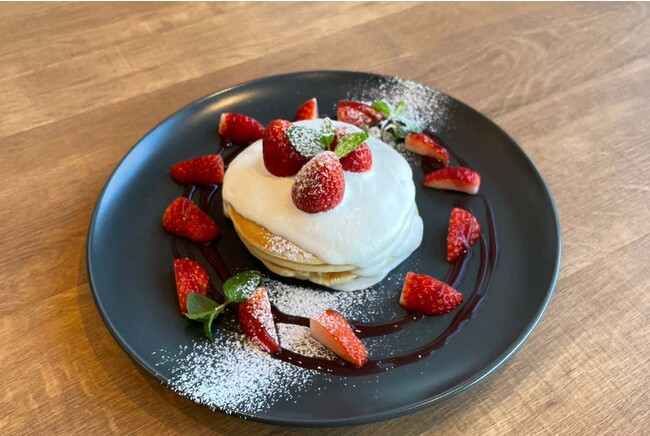 甘さ控えめの生クリームと旬のいちごを贅沢にあしらい、周りにはほんのり酸味がアクセントのベリーソースを。絶妙にマッチする甘さと酸味のバランスをパンケーキと一緒にお楽しみください。