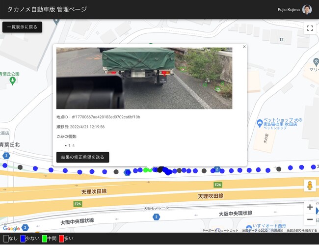 この度、「タカノメ自動車版」を活用し、日常業務であるごみ収集作業とともに地域の路上ごみを可視化することで、「ごみ」の問題を多面的に発信していくべく、この度の導入に至りました。ごみの分布データから見える地域の現状や課題を発信し、地域とともに解決へと繋げていきたいと考えています。
