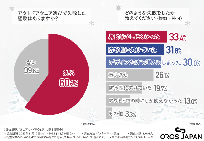 『身動きがしにくかった』『防寒性に欠けていた』『デザインだけで選んでしまった』と回答した方が多く、実際にアウトドアを楽しんでいる時に着用してみると不便さを感じ、失敗したと気づくのではないでしょうか?