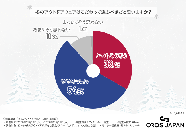 「冬のアウトドアウェアはこだわって選ぶべきだと思いますか?」と質問したところ、『とてもそう思う(33.4%)』『ややそう思う(54.9%)』『あまりそう思わない(10.3%)』『まったくそう思わない(1.4%)』という回答結果となりました。