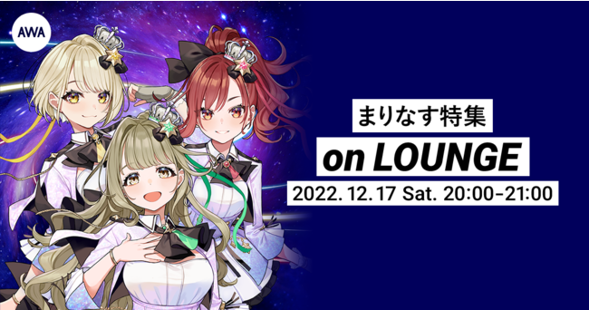 AWA株式会社(本社:東京都港区、代表取締役CEO:冨樫晃己)が運営する、サブスクリプション型(定額制)音楽ストリーミングサービス「AWA(アワ)」は、2022年12月17日(土) 20:00~21:00の1時間、無料で誰でも参加できるオンライン空間「ラウンジ」で、まりなすのメンバーが、音声とチャットで参加する、AWAラウンジを開催いたします。