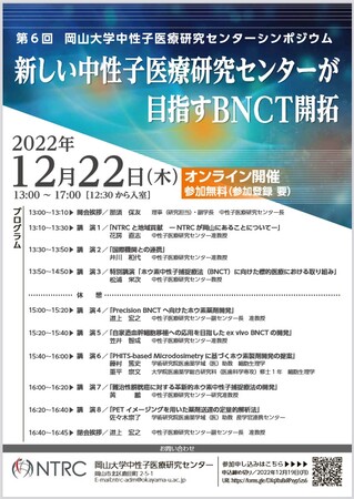 【岡山大学】第6回岡山大学中性子医療研究センターシンポジウム ~新しい中性子医療研究センターが目指すBNCT開拓~〔12/22 木, オンライン〕
