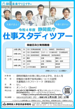 静岡県は、静岡県職員の仕事に関心があり、県職員採用試験の受験を検討している方を対象に、「静岡県庁 仕事スタディツアー」(業務説明会)を開催します。