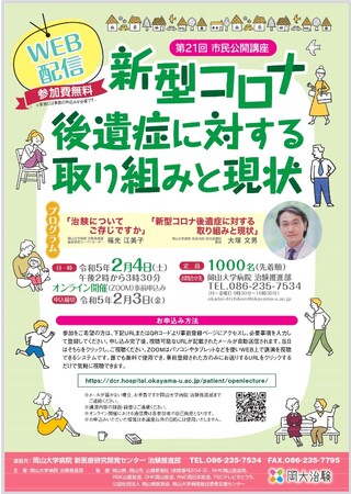 【岡山大学】岡山大学病院 治験推進部 第21回市民公開講座「新型コロナ後遺症に対する取り組みと現状」〔2/4土, オンライン〕