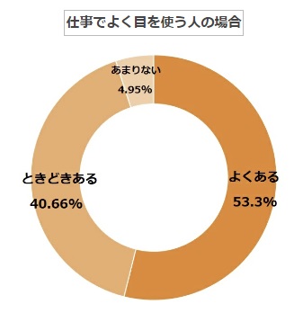また、年代を区切らず“仕事で目をよく使う人”の結果を見ると、こちらも9割以上の人“が疲れを感じることがある”との回答ですが、全体と比較した際に、“ある”と回答した人トータル割合としてはほぼほぼ同じ数値となっています。