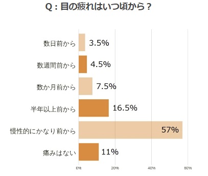 どのくらいの期間、目の疲れに悩んでいるかを質問したところ、6割近くの人が慢性的にかなり前からと回答。 更に半年以上前・数か月前という人を合わせると8割以上にものぼります。この結果から、目の疲れを感じる殆どの人が、長期的に悩まされていることが伺えます。