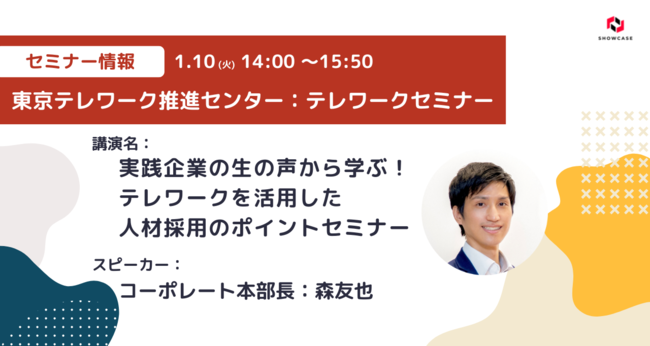 企業と顧客をつなぐDXクラウドサービスを展開する株式会社ショーケース(東京都港区、代表取締役社長:永田豊志、証券コード:3909、以下ショーケース)は、東京都が運営する東京テレワーク推進センターが主催する「実践企業の生の声から学ぶ!テレワークを活用した人材採用のポイントセミナー」にコーポレート本部長:森が登壇することをお知らせいたします。