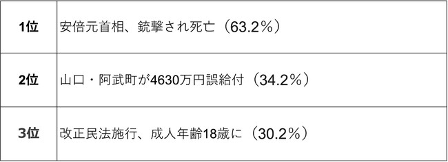 結果は「安倍元首相、銃撃され死亡」が他を圧倒しての1位(63.2%)。弁護士からは「元総理大臣が暗殺されるという前代未聞の事態と警備体制の杜撰さに衝撃を受けた」「背景に旧統一教会の問題があることで、さらに衝撃だった」とコメントが寄せられた。山口県阿武町が給付金4630万円を住民1人に誤って振り込んだ事件は、2位(34.2%)にランクインした。国税徴収法や地方税法などを駆使して返金につなげた町の手法について「最終的に債権回収に成功してすごい」など、町側の代理人の奮闘をたたえるコメントも並んだ。3位(30.2%)には、改正民法が施行され、成人年齢18歳になったニュースがあげられた。「18歳19歳の方の権利関係に大きな変化が生じたため」(弁護士)というコメントなどから、法律実務に携わる弁護士だからこそより印象強いニュースだったことが窺える。