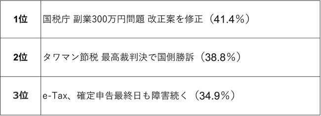 1位「国税庁 副業300万円問題 改正案を修正」(41.4%)、2位「タワマン節税 最高裁判決で国側勝訴」(38.8%)、3位「e-Tax、確定申告最終日も障害続く」(34.9%)と、上位のニュースはいずれも、「顧客先に大きな影響を与える可能性があった」などといったコメントが多く寄せられていた。本人だけでなく、顧問先への影響も懸念される話題が上位に選ばれているのは、やはり税理士ならでは。2位「タワマン節税」や6位「インボイス」については、2023年も引き続き動向が見逃せないニュースとなっている。