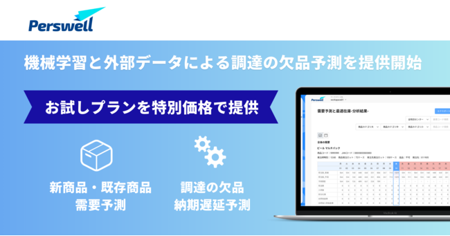 最新の外部データと機械学習で高度な需要予測ができる「Perswell(パースウェル)」、「調達の欠品・納期遅延予測」「商品需要予測」を低コストで試せるプランを提供開始