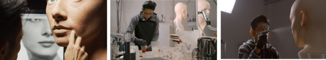 Kazu Hiro氏は実物の2倍サイズの粘土彫刻を作り、それを型にとってシリコーンの顔を仕上げていきます。肌のテクスチャー(凹凸)は彫刻の段階で作ります。さまざまな形状の針金、猫の毛を整えるブラシや指サックなどを巧みに使い、丸や縦長などの何万個もの毛穴、毛穴と毛穴を繋ぐ小さなシワを表現します。その後、人間の肌の色や質感はシリコーンの顔に色を重ねて再現します。静脈の青、毛細血管の赤、メラニンの色を想定した黄色と茶色の4色を、エアブラシを使って細かく調整しながらのせていきました*2。