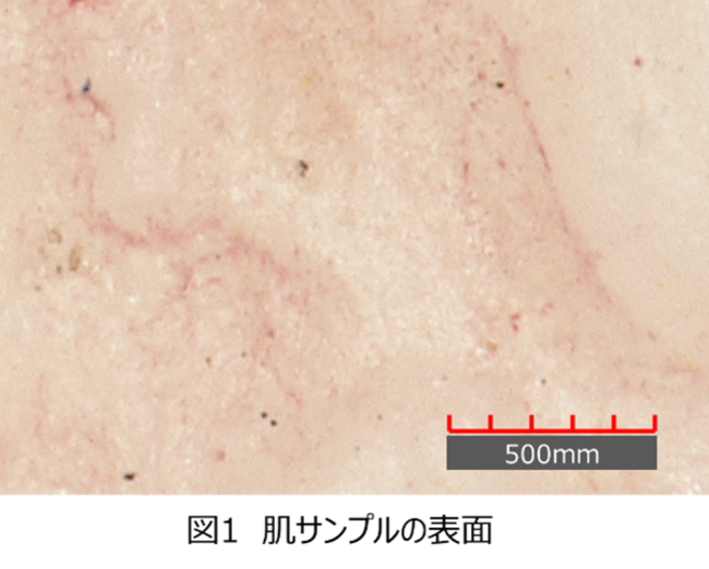 その結果、肌サンプルの表面には、実際の肌に特有のキメなどの構造とは異なる形状の微細な凹凸が見られた一方で、見る角度や照明の角度を変えると、凹凸感や光沢感の変化の仕方が、実際の肌と同じ傾向にあることがわかりました。さらに興味深いことに、Kazu Hiro氏がサンプル表面に色材を意図的に不均一に付着させた状態は、毛細血管のように見える部分があることも確認できました。