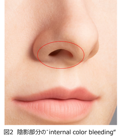人の肌には半透明性があり、光が当たると、その光の一部は肌を透過し、肌内部で散乱・吸収され、その後肌の外に出ていきます。そこで今回、肌サンプルが人の肌と同様の半透明性を持っているのかを、花王が開発したエッジロス法*3を用いて分析しました。この結果、Kazu Hiro氏による肌サンプルは、長波長ほど半透明性が高いといった人の肌で見られる性質が認められました。さらに、人の肌特有の半透明性によって生じる、陰影部分が赤く色づいて見える“internal color bleeding”*4と類似した現象が見られることも確認できました(図2)。