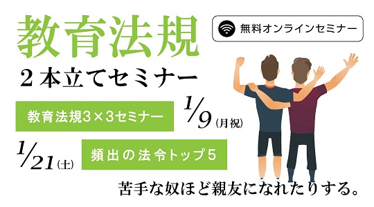 【教員採用試験】教育法規を得点源に!無料オンラインセミナー「頻出の法令トップ5」「教育法規3×3セミナー」を開催