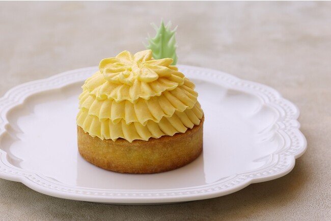 里山にいち早く春を告げるたんぽぽをモチーフにしたケーキ。可愛らしい花びらは、金柑のバタークリームで仕上げています。紅茶風味のダマンドにローズマリーの香りをまとったミルクムースをのせて、金柑のコンフィをひそませました。暖かな太陽の光が感じられるようなケーキです。