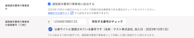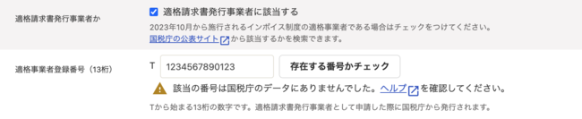 ・「適格請求書発行事業者の登録番号」項目に表示された[存在する番号かチェック]ボタンをクリックすると、入力された登録番号と国税庁のデータベースを照合し、同一の番号が存在するかどうかをチェックできます