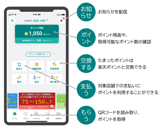 App storeまたはGoogle Playより「グリーンアクションポイントアプリ」をダウンロードのうえ、(7)に記載の環境配慮行動を実践した際に店舗で表示されるQRコードをアプリで読み取ることでポイントが付与されます。