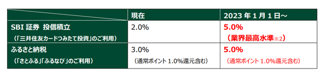 プラチナプリファードによるSBI証券での投信積立、および「さとふる」「ふるなび」でのふるさと納税寄附について、2023年1月決済分※1より、Vポイント還元率を5.0%に引上げます。なお、既にプラチナプリファードで投信積立をされているお客さまは、手続きなく5.0%のVポイント還元の対象となります。