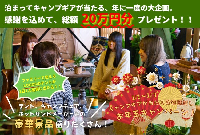 【総額20万円分のキャンプ用品が泊まって当たる!】年末年始はグランピング!お年玉抽選会や年越しそば無料券など、楽しくお得に過ごせる限定イベントが盛りだくさん!〈12/29~1/3限定〉