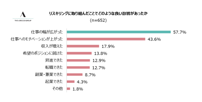 続けて、リスキリングに取り組んだことで仕事やキャリアに良い影響があったと回答した652人に対し、「具体的にどのような良い影響がありましたか」と質問したところ、良い影響としてもっとも多く挙げられたのは「仕事の幅が広がった」(57.7%)、次いで「仕事へのモチベーションが上がった」(43.6%)でした。