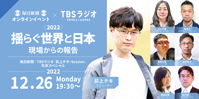 毎日新聞社(代表取締役社長執行役員:松木健)は、TBSラジオの人気番組「荻上チキ・Session」と共同で、「<2022>揺らぐ世界と日本~現場からの報告」と題したオンラインイベントを12月26日(月)午後7時半から開催します。ロシアによるウクライナ侵攻をはじめ、国内外でニュースが相次いだ2022年。世界で、日本で、現場を取材してきた記者たちの報告を聞きながら一緒に今年を振り返り、来年を展望してみませんか。ぜひ、ご参加ください。