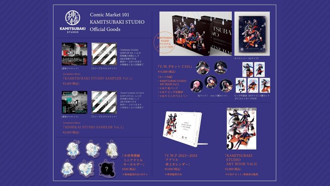 そんなイラストをあしらった新コミケグッズは、V.W.Pメンバーによるボイスメッセージ付きのビッグ年賀状や、缶バッジ、タペストリーなどの商品を同梱したV.W.Pセット、公式アートを多数収録したKAMISTUBAKI STUDIO ART BOOK Vol.3や、アクリル卓上カレンダーも登場します。