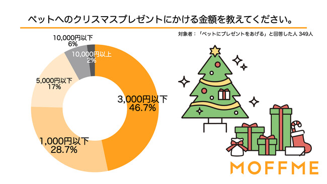 具体的にプレゼントの準備にかかる費用は1,000円以下と回答した方が28.7%、3,000円以下と回答した方が46.7%と、高額なプレゼントではなく、手頃な金額でペットへのプレゼントをする方が多いことがわかりました。