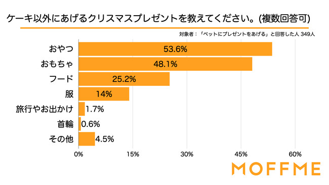 おやつが53.6%、おもちゃが48.1%と、ペットにプレゼントをして喜ぶものとして食べ物や遊び道具を選ぶ人が多いという結果となりました。