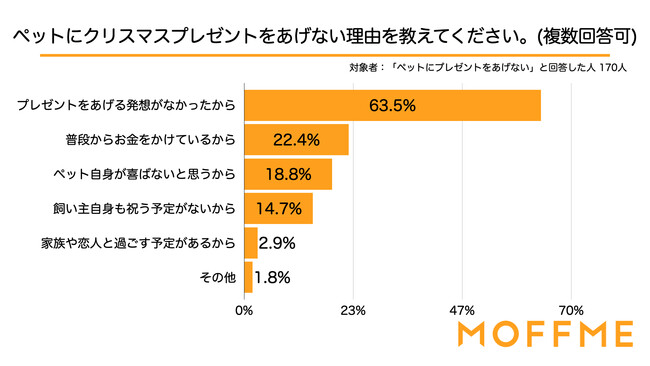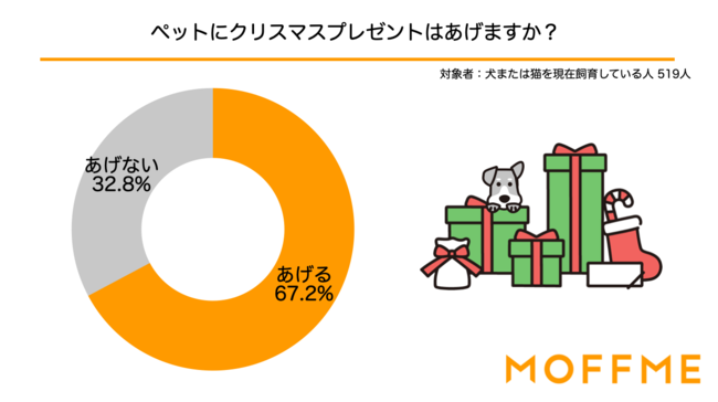 「ペットにクリスマスプレゼントはあげますか?」という質問に対して、クリスマスプレゼントをあげると回答した人はなんと67.2%と、約7割の人がペットのためにクリスマスプレゼントを用意していることがわかりました。