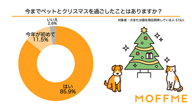 去年までの段階で、ペットとクリスマスを過ごしたことがあると回答した方は、85.9%、今年が初めてと回答した方は、11.5%となっており、ペットも家族の一員として一緒にクリスマスを過ごすご家庭が多いという結果でした。