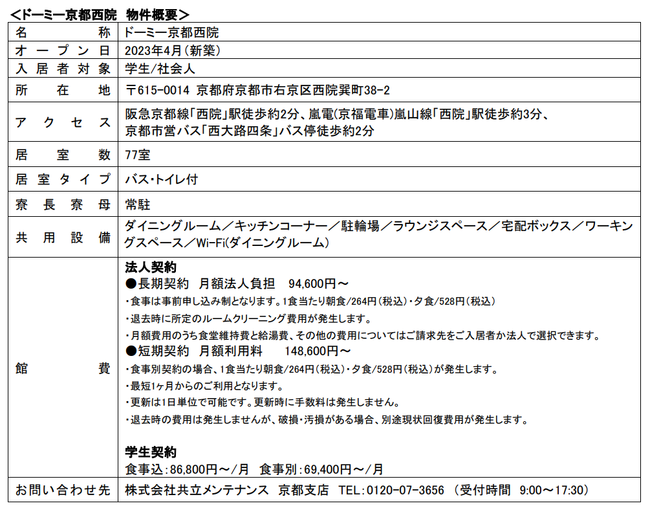 ス/代表取締役社長:中村幸治/本社:東京都千代田区)は2023年4月、京都市右京区に学生寮・社員寮「ドーミー