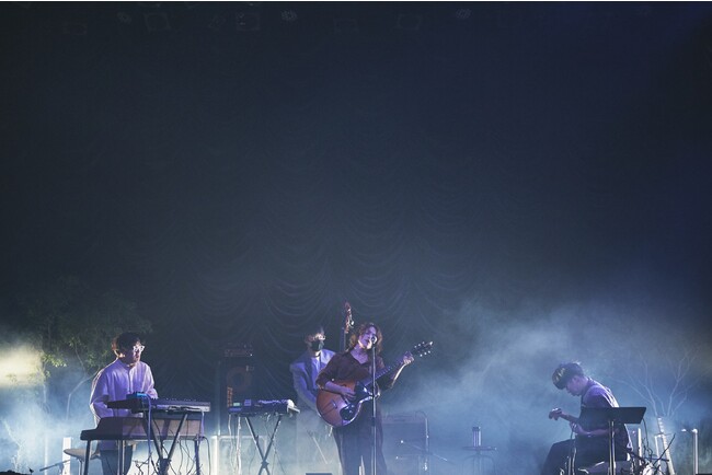 先にステージへ上がったのは、優河 with 魔法バンド。ドラマーの神谷洵平が体調不良のため、優河(Vo&Gu)、岡田拓郎(Gu)、千葉広樹(Ba)、谷口雄(Key)というドラムレスでの出演に急遽なったけれど、よりアコースティック感の強いこの変則的な編成も、今回ならではのグルーヴが楽しめるという点で貴重なものだったように思う。