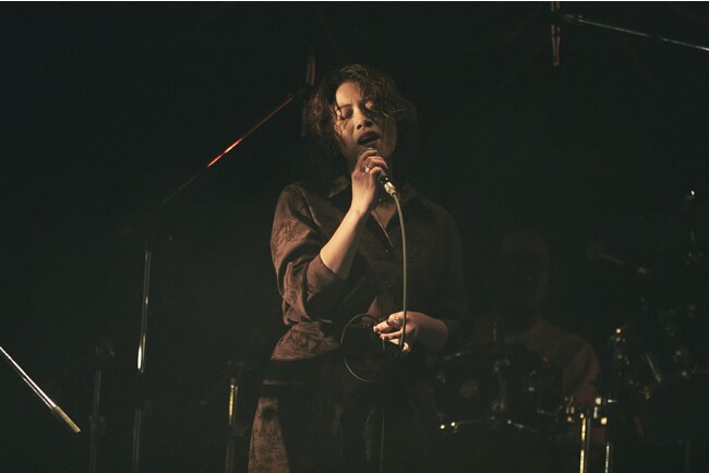 どんなスタイルの演奏であれ、やっぱり優河の声はすごい。彼女が歌い始めると、一瞬にして会場の空気が変わる。スモークがほんのり漂う中、倍音成分や包容力を湛えた、それでいて余分な感情が乗りすぎていない独特の儚いボーカルをもって、まずは「やわらかな夜」「WATER」と、最新アルバム『言葉のない夜に』の収録曲を聴かせ、瞬く間にオーディエンスの度肝を抜いた。