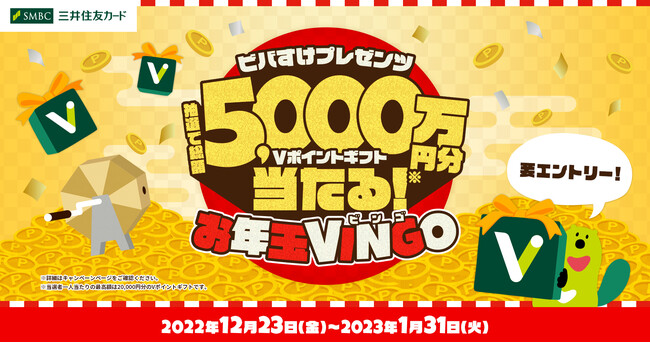 三井住友カード株式会社(本社:東京都江東区、代表取締役社長:大西 幸彦、以下:三井住友カード)は、条件達成でVポイントギフトが当たる「ビバすけプレゼンツ~総額5,000万円分!「VINGO」でお年玉をゲットせよ!」(以下、本キャンペーン)を実施いたします。