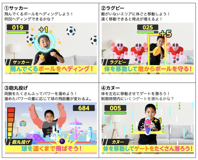『うごっこランドスポーツ』では、サッカー、ラグビー、砲丸投げ、カヌーの4つのスポーツを楽しめるAR運動ゲームです。