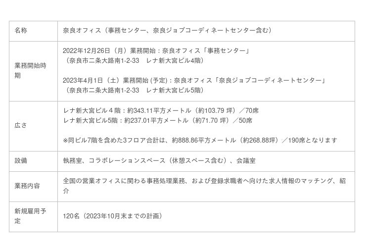 これに伴い、全国の営業オフィスで担ってきた事務処理業務を奈良オフィス「事務センター」に集約し、業務の標準化やRPAなどを活用した生産性の向上を図ります。また堅調な人材ニーズに適切かつ迅速に対応していくために、既存のジョブコーディネートセンターの機能拡充も必要となっています。