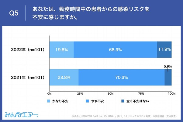 「Q5.あなたは、勤務時間中の患者からの感染リスクを不安に感じますか。」と質問したところ、2022年(n=101)は「かなり不安」が19.8%、「やや不安」が68.3%、2021年(n=101)は「かなり不安」が23.8%、「やや不安」が70.3%という回答となりました。
