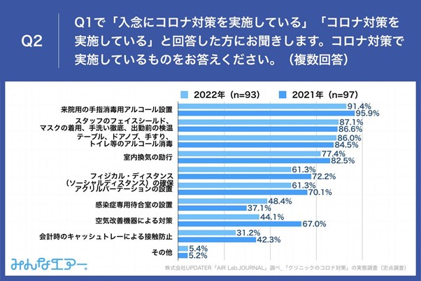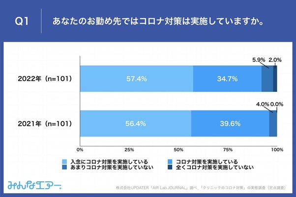 「顔の見えるライフスタイル」の実現を目指す株式会社UPDATER(所在地:東京都世田谷区、代表取締役:大石英司)のWell-being tech事業「みんなエアー」(https://minnaair.com/)は、全国の病院・クリニックで勤務する医療従事者101名を対象に、「クリニックのコロナ対策」の実態調査(定点調査)を実施しました。尚、本調査は2021年に発表した同内容の調査(※)の定点観測調査です。