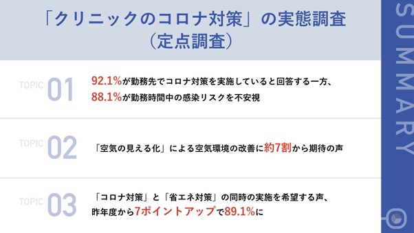 まず、勤務先のクリニックのコロナ対策について伺うと、92.1%が「実施している」と回答する一方で、医療従事者の88.1%が勤務時間中の患者からの感染リスクに不安を感じている実態が明らかになりました。そこで、感染対策の1つでもある空気環境についても伺うと、約7割が「空気の見える化」による空気環境の改善に期待を示す結果に。また、「コロナ対策」と「省エネ対策」の同時の実施については、89.1%が希望しており、昨年度から7ポイントアップしました。