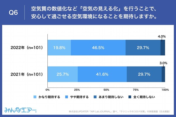 「Q6.空気質の数値化など「空気の見える化」を行うことで、安心して過ごせる空気環境になることを期待しますか。」と質問したところ、2022年(n=101)は「かなり期待する」が19.8%、「やや期待する」が46.5%、2021年(n=101)は「かなり期待する」が25.7%、「やや期待する」が41.6%という回答となりました。