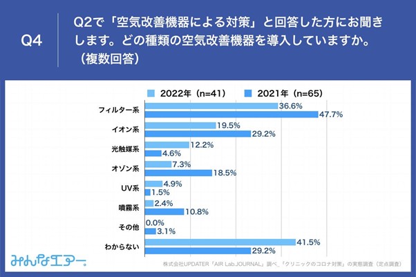 Q2で「空気改善機器による対策」と回答した方に、「Q4.どの種類の空気改善機器を導入していますか。(複数回答)」と質問したところ、2022年(n=41)は「フィルター系」が36.6%、「イオン系」が19.5%、2021年(n=65)は「フィルター系」が47.7%、「イオン系」が29.2%という回答となりました。