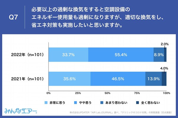 「Q7.必要以上の過剰な換気をすると空調設備のエネルギー使用量も過剰になりますが、適切な換気をし、省エネ対策も実施したいと思いますか。」と質問したところ、2022年(n=101)は「非常に思う」が33.7%、「やや思う」が55.4%、2021年(n=101)は「非常に思う」が35.6%、「やや思う」が46.5%という回答となりました。
