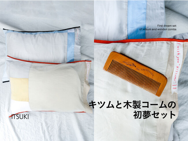 髪があたる上面にシルクコットンを用いて寝ている間の摩擦から髪を守るだけでなく、「富士山」と「打ち出の小槌」の縁起の良いモチーフをパッチワークデザインに落とし込んだ枕カバー「KITSUMU」を1つご購入いただくと、オリジナル木製コームをプレゼントします。