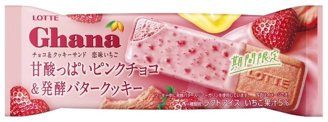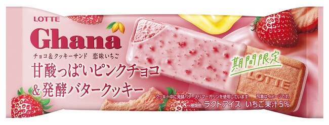 株式会社ロッテは1月2日(月)に、くちどけなめらかなチョコレート「ガーナ」ブランドから、アイスの商品『ガーナチョコ&クッキーサンド 恋味いちご』を発売します。ピンク色の発酵バタークッキーといちごチップ入りチョコ、いちごアイスの味わいがしっかりと楽しめます。パッケージはいちごをあしらったピンク色が映えるデザインで、いちごの季節をかわいらしく演出します。この時期だけの味わいをぜひお楽しみください!