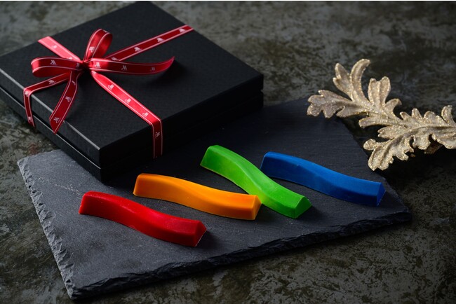 ビビッドなカラーと流線形のフォルムが印象的な、4種のチョコレートバー。自家製のビーントゥバーチョコレートに、赤色はフレーズバジル・黄色はマンゴーパッション・緑色はアプリコットピスタチオ・青色はカシスアールグレイのフレーバーに、それぞれガナッシュとパートドフリュイの2層を中に忍ばせています。カカオ本来の風味をしっかりと感じながら、4種それぞれの個性的な味わいを楽しめる逸品に仕上げました。
